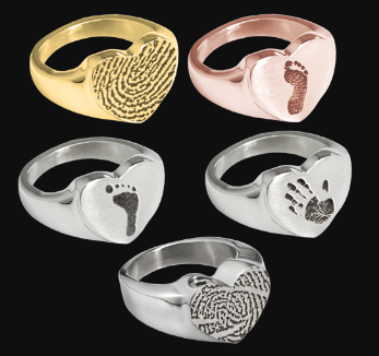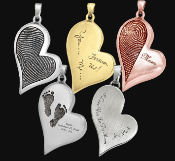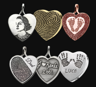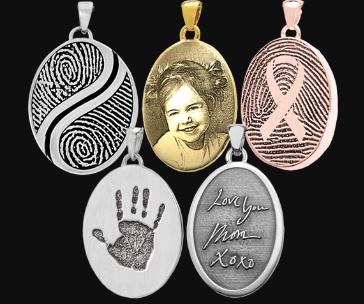 We have a great variety of cremation and fingerprint jewelry. The selection we have shown below are only some of the selections we have, however, many more are available. There are numerous options in design, choice of metal, and size; they can contain cremated remains and there are also ones that do not.